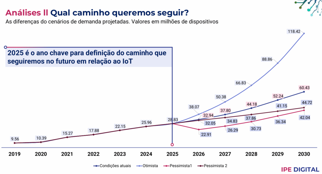 As projeções apontam consequências graves caso o benefício não seja prorrogado: a adoção de IoT sofreria uma queda significativa, com a demanda estagnando em 44 milhões de dispositivos até 2030 – um número bem abaixo dos 118 milhões que poderiam ser alcançados com a manutenção da política atual.