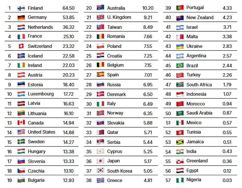 Em escore de 0 a 100, Brasil somou apenas 2,44. Líder Finlândia tem 64,50.