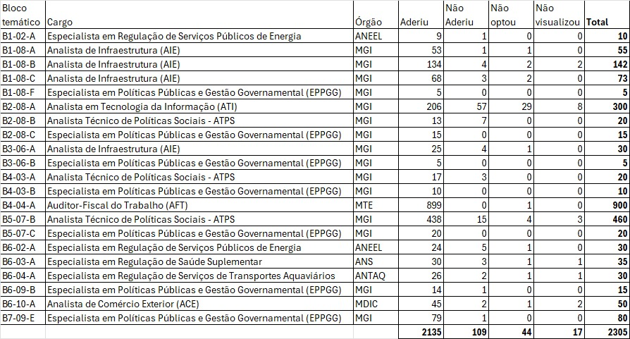 Das 300 vagas destinadas aos analistas de Tecnologia da Informação no Concurso Nacional Unificado, 94 não foram preenchidas por falta de interesse dos aprovados inicialmente. De acordo com o ministério da Gestão, desses 94, 57 não aderiram, 29 não optaram pela vaga e 8 não tiveram interesse em saber o resultado do concurso.