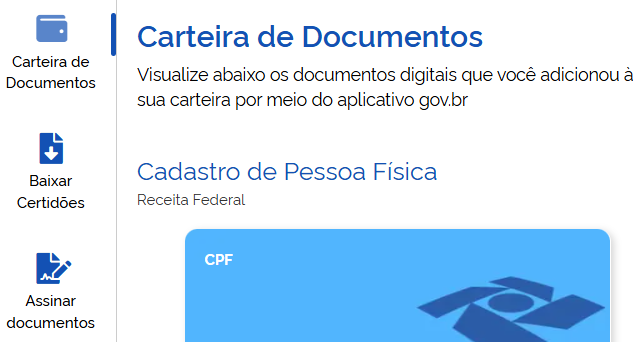São exemplos de documentos que ficarão disponíveis na barra a nova Carteira de Identidade Nacional (CIN), a Carteira Digital de Trânsito e o Certificado Militar. No mesmo ambiente, também será possível utilizar a Assinatura Eletrônica Gov.br, um dos serviços mais utilizados da plataforma.