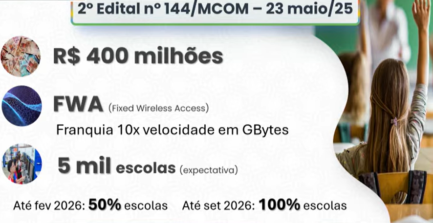 “Ao invés de a empresa contribuir com o FUST, faz o investimento de forma direta, podendo usar até 50% do recurso que ela recolheria. São R$ 400 milhões e com uma novidade: estamos permitindo as conexões de acesso fixo sem fio, FWA, com franquia de dados que seja 10 vezes a velocidade em GBytes. Para atrair também as empresas de conexão móvel. Com isso a gente tem expectativa de conectar mais 5 mil escolas, que somando com o primeiro edital vamos além de 20 mil escolas”, detalhou o secretário de Telecomunicações.