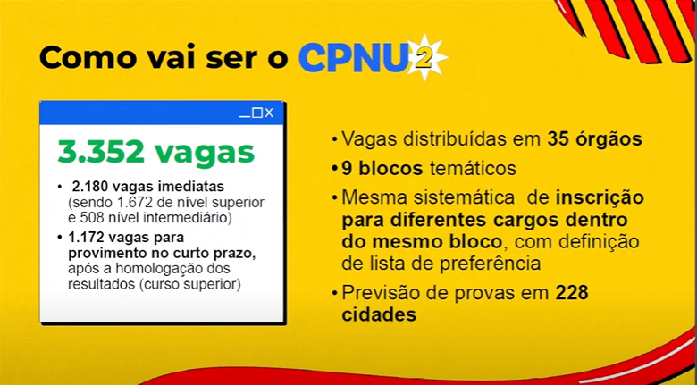 O governo federal anunciou nesta segunda, 28/4, detalhes da segunda edição do Concurso Público Nacional Unificado (CPNU), conhecido como “Enem dos Concursos”. Com 3.352 vagas distribuídas em 35 órgãos federais – inclusive 50 oportunidades na Agência Nacional de Telecomunicações, Anatel. Desta vez, porém, não há vagas para analistas de tecnologia da informação.