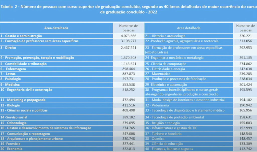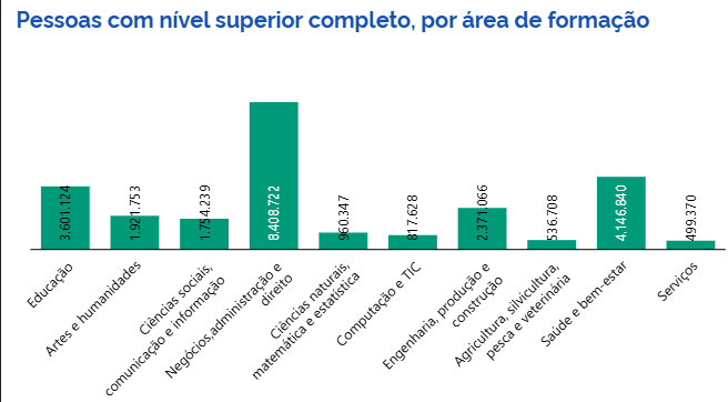 O Censo 2022 também detalhou a distribuição dos graduados por áreas de formação. O Direito lidera o ranking, com 2.467.521 profissionais formados, seguido por Medicina, com 553.538 graduados. Na área de Computação e Tecnologias da Informação e Comunicação (TIC), o número de graduados chegou a 817.625.