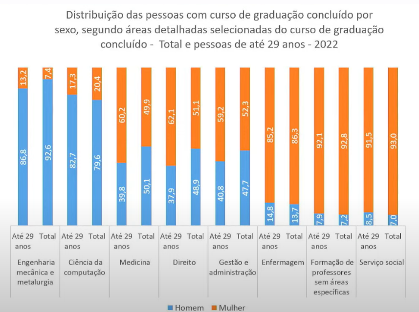 O levantamento destacou uma forte disparidade de gênero em áreas como Ciência da Computação, onde 79,6% dos graduados são homens – percentual que sobe para 82,7% entre os profissionais com menos de 29 anos. Essa área é a segunda com maior desigualdade entre os sexos, atrás apenas de Engenharia Mecânica e Metalurgia, onde 92,6% dos graduados são homens.