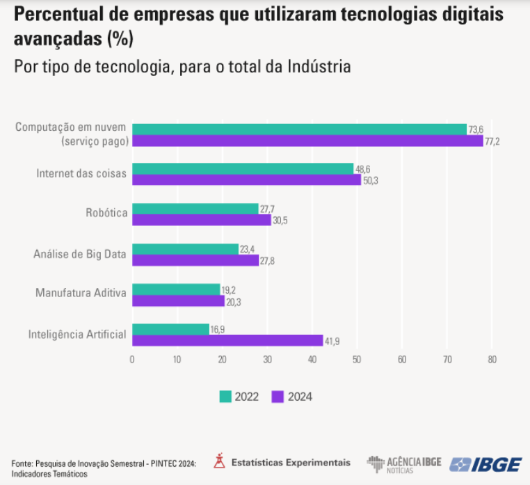 O uso da Inteligência Artificial nas indústrias brasileiras avançou rapidamente nos últimos dois anos. Segundo dados da Pesquisa de Inovação Semestral (Pintec) divulgados pelo IBGE, a adoção da tecnologia passou de 16,9% das empresas em 2022 para 41,9% em 2024, um salto de 25 pontos percentuais.