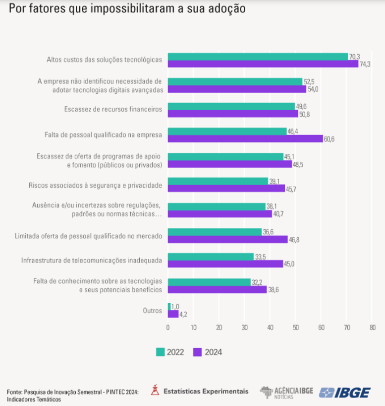 Os principais benefícios relatados pelas empresas ao adotar tecnologias digitais avançadas foram aumento da eficiência (90,3%) e maior flexibilidade em processos (89,5%). Apesar do avanço, custos elevados, falta de profissionais qualificados e desafios de integração entre áreas seguem como obstáculos.
