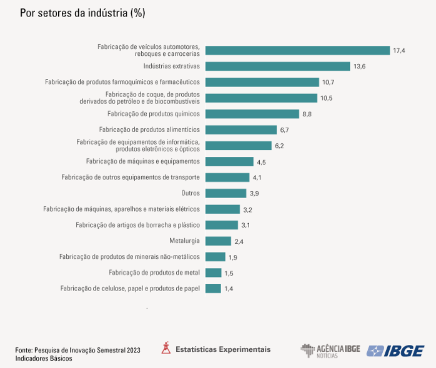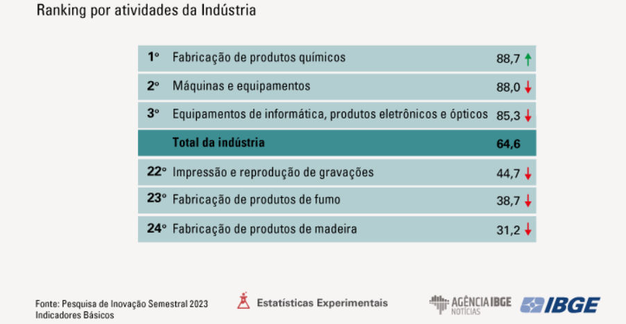 Os setores que mais se destacaram em inovação de produtos e processos em 2023 foram: Fabricação de produtos químicos (88,7%), Fabricação de máquinas e equipamentos (88,0%), Fabricação de equipamentos de informática, produtos eletrônicos e ópticos (85,3%) e Fabricação de produtos farmoquímicos e farmacêuticos (82,4%). Já os ramos com menor taxa de inovação foram Fabricação de produtos do fumo (38,7%) e Fabricação de produtos de madeira (31,2%).