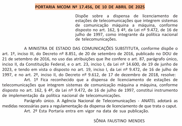O Ministério das Comunicações publicou uma portaria para determinar à Anatel que regulamente a dispensa de licenciamento para estações máquina a máquina.