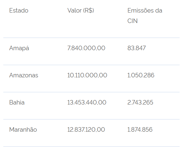 A Bahia receberá R$ 13,45 milhões, com previsão de emissão de 2,74 milhões de documentos; o Maranhão contará com R$ 12,83 milhões para 1,87 milhão de emissões; o Amazonas terá R$ 10,11 milhões para 1,05 milhão de carteiras; e o Amapá, R$ 7,84 milhões para 83,8 mil emissões.