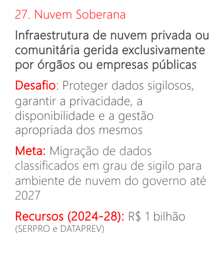 “A nuvem de governo ou nuvem soberana representa uma infraestrutura fundamental para a segurança e soberania digital do país. Ao concentrar dados governamentais e serviços nesta nuvem, gerida exclusivamente por órgãos públicos e empresas públicas, a nuvem de governo fortalece a proteção contra ameaças cibernéticas e assegura que informações sensíveis permaneçam sob controle nacional”, disse a Ministra Esther Dweck.