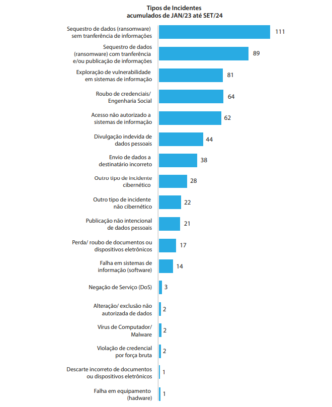 O documento destaca que a ANPD recebeu 1.063 comunicados de incidentes de segurança de dados até setembro deste 2024, sendo 250 relativos a ocorrências neste ano, com destaque para os casos de ransomware, que lideram com 45% das notificações.