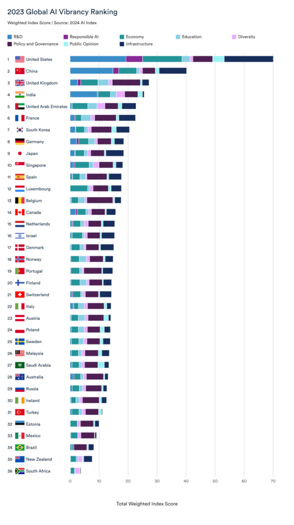 A fim de estabelecer algum parâmetro nesse campo, Stanford adotou o que chama de ‘Ferramenta de Vibração Global de IA’, trata-se de uma visualização interativa que faz comparações entre países dessa “vibração da IA”, usando 42 indicadores organizados em 8 pilares.