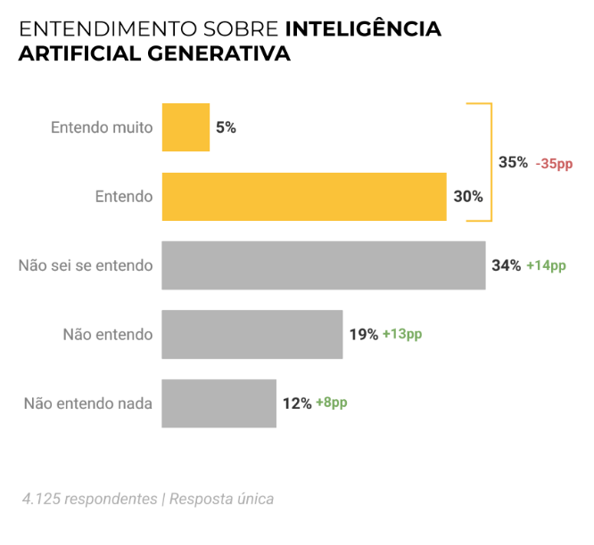 O estudo também investigou o nível de familiaridade dos brasileiros com a tecnologia, ouvindo 4.125 pessoas. Os resultados mostram que apenas 5% afirmam entender muito sobre IA, enquanto 30% dizem ter um conhecimento básico. Por outro lado, 34% declararam não ter certeza se entendem a ferramenta, e 31% admitiram não compreendê-la ou não compreendê-la de forma alguma.