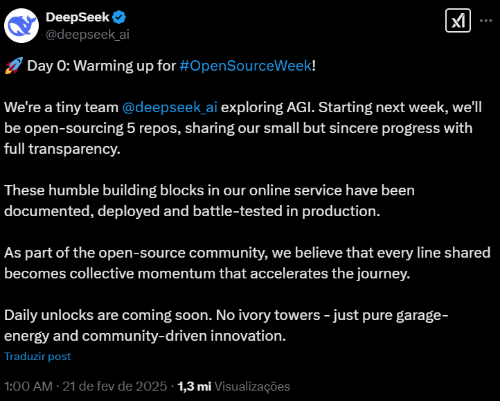 “Acreditamos que cada linha de código compartilhada gera um impulso coletivo para acelerar a inovação”, afirmou a DeepSeek em postagem no X. “Nada de torres de marfim — só energia de garagem e inovação impulsionada pela comunidade.”