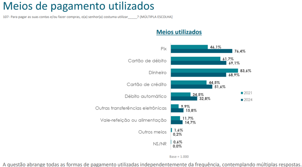 No levantamento de 2021, o dinheiro aparecia como o meio de pagamento mais utilizado pelos brasileiros: ele era utilizado por 83,6% da população, sendo o mais frequente para 42% dos entrevistados.