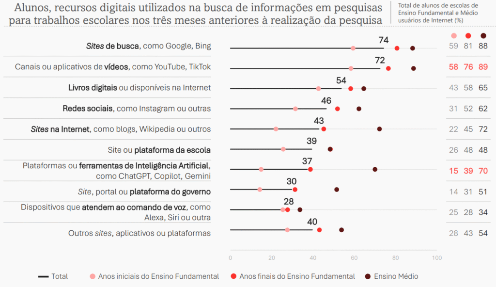 “Sete em cada dez alunos no ensino médio já usa IA generativa para auxiliar nas pesquisas escolares. E se esse é um retrato de 2024, mostra que essa adoção se deu em um curtíssimo espaço de tempo e precisa servir de alerta. O ambiente escolar precisa incorporar tecnologia, mas de forma crítica e responsável”, destacou a coordenadora do CGI.br, Renata Mielli.