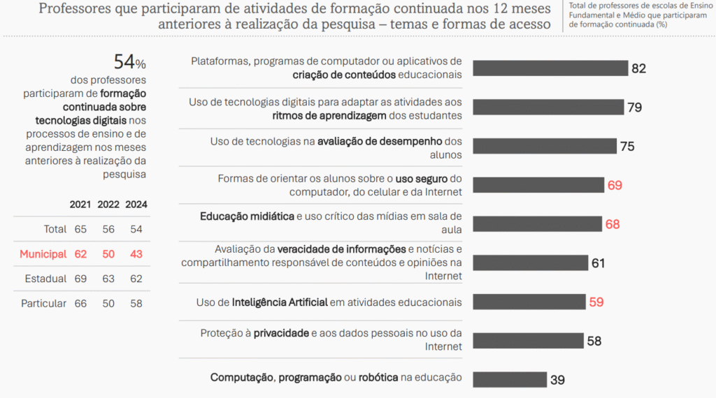 A pesquisa mostra ainda que a preparação dos docentes para lidar com essas ferramentas é insuficiente. Apenas 54% dos professores participaram de atividades de formação continuada sobre tecnologias digitais, e em muitos casos sem foco específico em inteligência artificial.