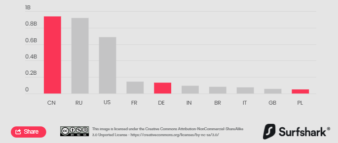 Os dados mostram ainda que a Europa foi a região mais impactada globalmente, com 1,6 bilhão de contas vazadas, representando 29% do total, seguida pela Ásia, com 1,3 bilhão (23%), e pela América do Norte, com 770 milhões (14%). Entre os países europeus mais atingidos estão Rússia, Alemanha, França, Itália e Reino Unido. Na Ásia, os principais alvos foram China, Índia, Japão, Vietnã e Filipinas.
