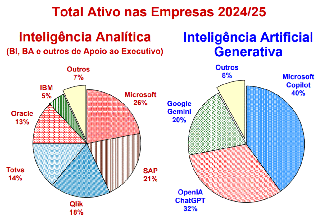Os programas de Inteligência Analítica (BI – Business Intelligence and Analytics) continuam sendo uma categoria de destaque e entre as mais lucrativas para os fabricantes. Microsoft, com 28%; SAP, com 21%; Qlik tem 18%; seguidos por Oracle, Totvs e IBM. Os seis detêm 93% desse segmento. Apesar de todo o arsenal de ferramentas modernas, 90% do uso de Inteligência Analítica no departamento financeiro das empresas é Excel.