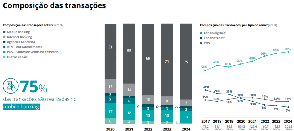 Mais do que isso, o uso do celular como banco é também cada vez mais intenso, o que foi determinante para um novo recorde – em 2024, pela primeira vez foram mais de 200 bilhões de transações (208,2 bi).