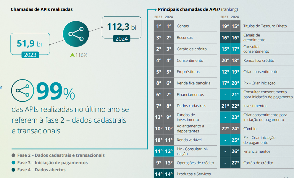 Mais significativo foi o aumento de 116% no volume de chamadas de API de open finance, de 51,9 bilhões para 112,3 bilhões. A imensa maioria delas (99%) envolvem dados cadastrais e transacionais, especialmente sobre contas, recursos, cartões de crédito e consentimentos.