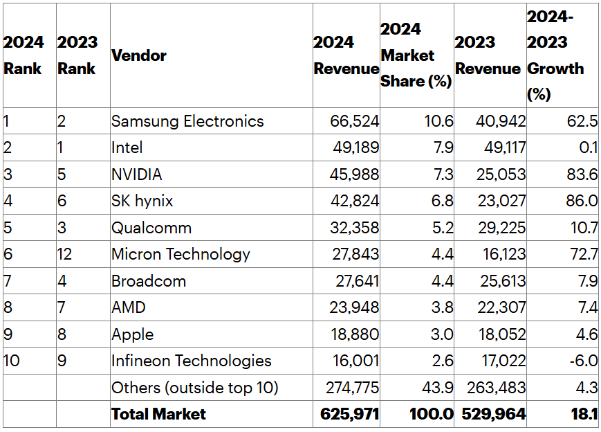 A Intel, que caiu para a segunda posição, não conseguiu compensar os desafios de sua linha de aceleradores de IA, apesar do desempenho de seus PCs com IA e do chipset Core Ultra. A receita da empresa ficou praticamente estagnada, com crescimento de apenas 0,1% em 2024. Já a Nvidia se destacou, registrando um crescimento expressivo de 84% na receita, atingindo US$ 46 bilhões (R$ 266 bilhões) e subindo para a terceira posição no ranking global, impulsionada pelo sucesso de seus chips voltados para IA.