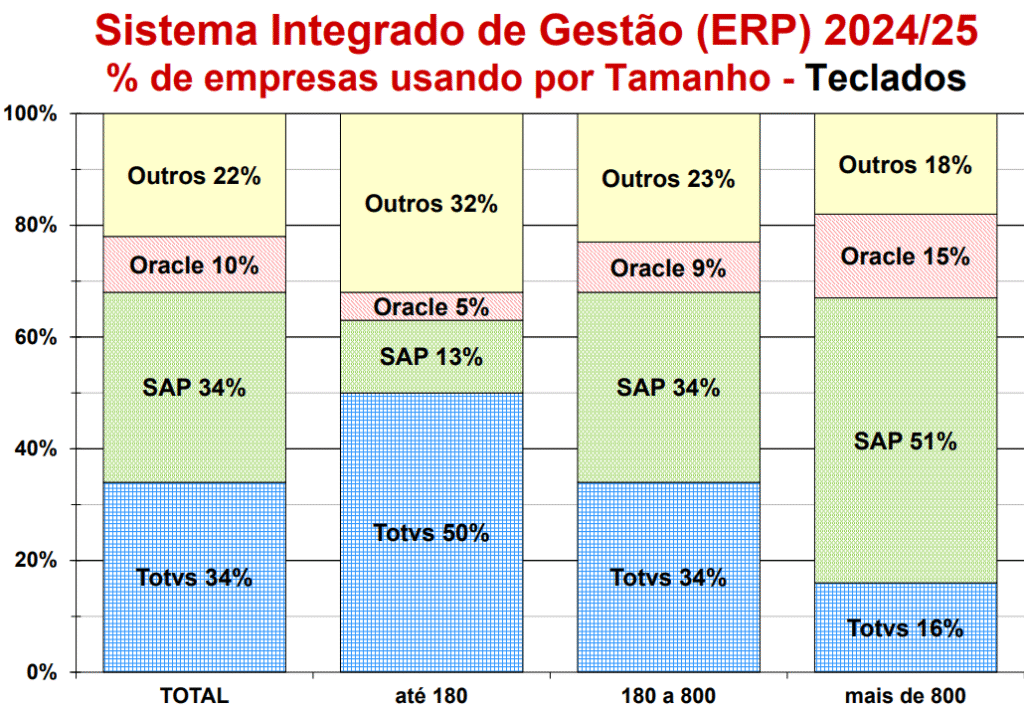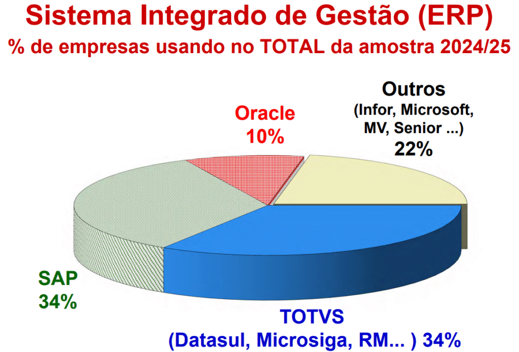 O estudo confirma que o Brasil segue uma tendência global de concentração de fornecedores de ERP. Por aqui, SAP e Totvs dividem a liderança, cada uma com 34% de participação, seguidas pela Oracle (10%), enquanto outros fornecedores somam 22%.