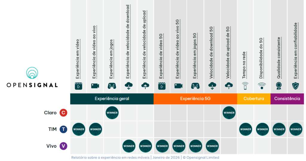 O relatório analisou o desempenho da Claro, TIM e Vivo ao longo de um período de 90 dias, entre 1º de outubro e 29 de dezembro de 2025, incluindo avaliações regionais nos 26 estados e no Distrito Federal. Na análise nacional, a TIM manteve o prêmio de Experiência em Vídeo com 63 pontos em uma escala de 100, enquanto Claro e Vivo ficaram a apenas um ponto de distância. Todas figuraram na categoria “Boa”, o que indica capacidade média de entregar vídeo em 720p ou superior, com tempos de carregamento adequados e baixo nível de interrupções. As medições utilizam metodologia baseada em parâmetros da União Internacional de Telecomunicações, com fluxos de vídeo reais transmitidos em diferentes resoluções, incluindo Full HD e 4K.