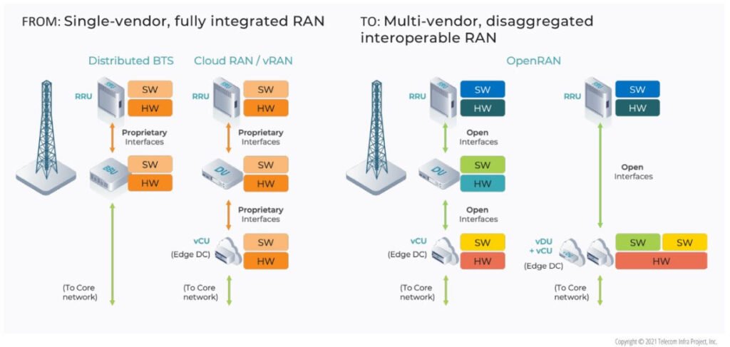 Em compasso com essas tendências, vem sendo desenvolvido um conjunto de tecnologias habilitadoras para a abertura e desagregação das redes móveis conhecido como Open RAN – sigla em inglês para rede de acesso por rádio (RAN) aberta. O objetivo é permitir a combinação de soluções tecnológicas de fornecedores distintos, a partir de especificações abertas de componentes e interfaces – o que traz flexibilidade, potencializa a independência e abre caminho para a introdução mais rápida de inovações.