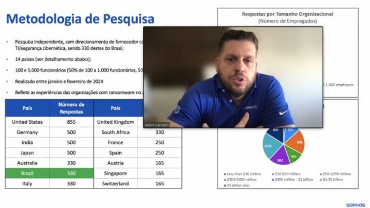 “Vemos um direcionamento maior dos ataques buscando empresas com mais capital, mas com times de tecnologia não tão grandes. E o Brasil está, cada vez mais, no cenário de direcionamento de ataque, com foco em empresas com mais de mil usuários, grande faturamento e equipe enxuta de TI”, comparou André Carneiro, diretor-sênior da Sophos no Brasil, durante a apresentação para a imprensa da pesquisa Estado do Ransomware 2024, encomendada pelo fabricante. Realizada entre janeiro e fevereiro de 2024, os entrevistados foram solicitados a responder com base em suas experiências de 2023.