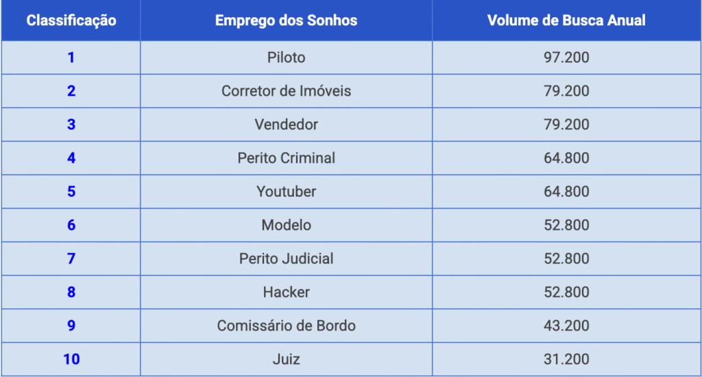 Globalmente também fazem parte do top 10, as carreiras de engenharia de software e ciência de dados. A definição por emprego dos sonhos, reforça o estudo, varia de pessoa para pessoa, moldada pela paixão, interesses, valores, motivações, habilidades e personalidade de cada um.