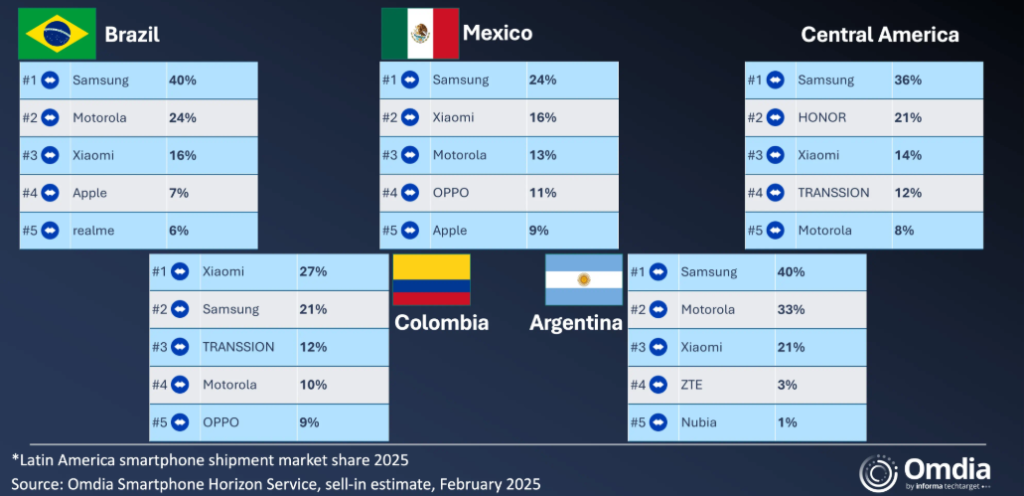 Na América Central, Samsung e Motorola recuperaram participação diante da expansão estratégica de concorrentes como Xiaomi, Honor e Transsion. O Equador seguiu tendência semelhante, com a chegada de ZTE e Nubia.
