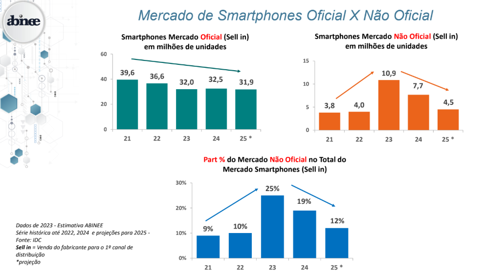 Segundo a Abinee, fatia dos aparelhos contrabandeados está em 12%. Era 19%, em 2024 e chegou a 25%, em 2023. “Tem que ser zero”, diz entidade.