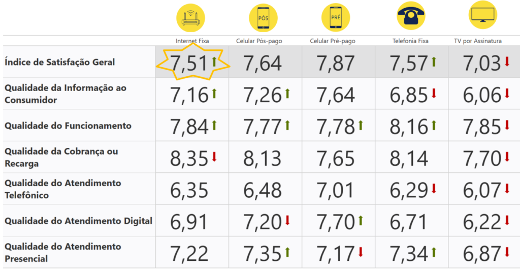 A TV por assinatura teve as piores notas no Índice de Satisfação Geral, na Qualidade de Informação ao Consumidor e na Qualidade do Atendimento, tanto telefônico como digital ou presencial. E também caíram as notas de Funcionamento e de Cobrança ou Recarga.