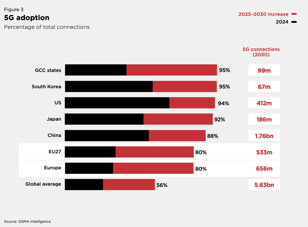 O estudo pontua que, apesar de o 5G vir a se tornar a tecnologia móvel dominante na Europa até 2026, o continente está ficando para trás em relação à outras regiões, incluindo América do Norte, Leste Asiático e os estados do Conselho de Cooperação do Golfo (GCC), onde GSMA diz que a atenção agora está sendo voltada para o 5G autônomo (5G SA) e o 5G avançado (5G-A).