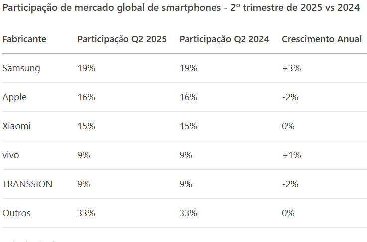 A Samsung manteve a liderança, com 19% de participação no mercado, impulsionada pela linha Galaxy A. A Apple ficou em segundo lugar, com 16%, seguida pela Xiaomi, com 15%. vivo e TRANSSION completaram o top 5, cada uma com 9% de market share.